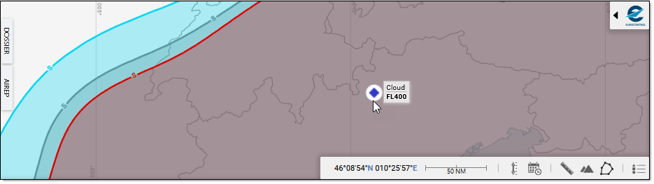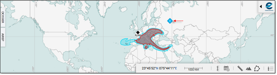 A cluster is a group of distinct AIREPs too close to each other to be individually plotted at a given zoom level - a numeral indicates the number of items it stands for (2 in this example):
