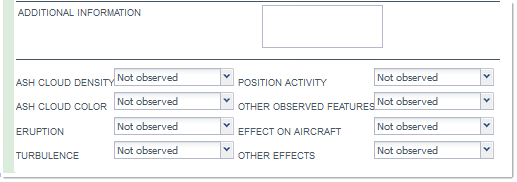 UTC time is expressed in hours in two numeric and minutes in two numeric. The time reported must be the actual time of the encounter observation. - TYPE: Select the type of observation from the proposed list (CLOUD, ASH, ERUPTION, SMELL or OTHER).