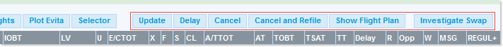 The Update, Delay, Cancel, Cancel and Refile, Show Flight Plan and Investigate Swap buttons are specific to the AO and ARO roles. They will be visible or not depending on your profile, and enabled or disabled depending on the status of a given Flight.