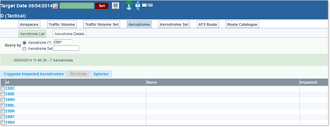 The Aerodrome List tab lists the aerodromes that are grouped in the selected aerodrome set for the selected Target Date.