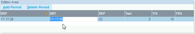 - If a period has not yet started (i.e. the WEF is after the current UTC time), the following are displayed as read-only: TIS, TRS, Arrival Taxi Time.