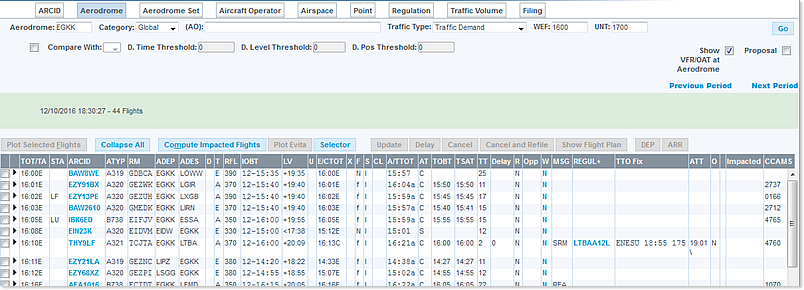 TOT/TA, STA, ARCID, ATYP, ADEP, ADES, D, RM, T, ARF, IOBT, LV, U, E/CTOT, X, F, S, CL, A/TTOT, TOBT, TAST, TT, AT, Delay, R, Opp, W, MSG, REGUL+, TTO Fix, ATT, O, Impacted, CCAMS.