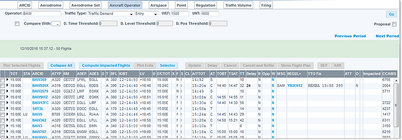TOT, STA, ARCID, ATYP, ADEP, ADES, D, RM, T, ARF, IOBT, LV, U, E/CTOT, X, F, S, CL, A/TTOT, AT, TOBT, TSAT, TT, Delay, R, Opp, W, MSG, REGUL+, TTO Fix, ATT, O, Impacted, CCAMS.