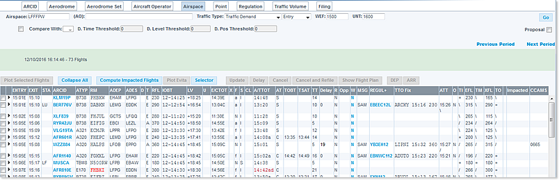 ENTRY, EXIT, STA, ARCID, ATYP, ADEP, ADES, D, RM, T, ARF, IOBT, U, E/CTOT, X, F, S, CL, A/TTOT, AT, TOBT, TSAT, TT, Delay, R, Opp, W, MSG, REGUL+, TTO Fix, ATT, O, TI, EFL, TM, XFL, TO, Impacted, CCAMS.
