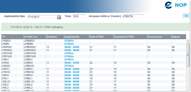 - Applicability: The applicability time period (hh:mm – hh:mm) of the attached OTMV definition for the Applicability Date selected in the query, when a definition is present. Otherwise the OTMV keyword is displayed to always allow for the implementation of the link described in 5.1.4.2.
