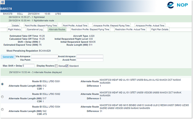 By default, the alternate routes list only displays alternative Standard routes (the CFMU system initially returns all potential alternative Standard routes).