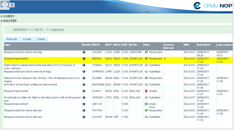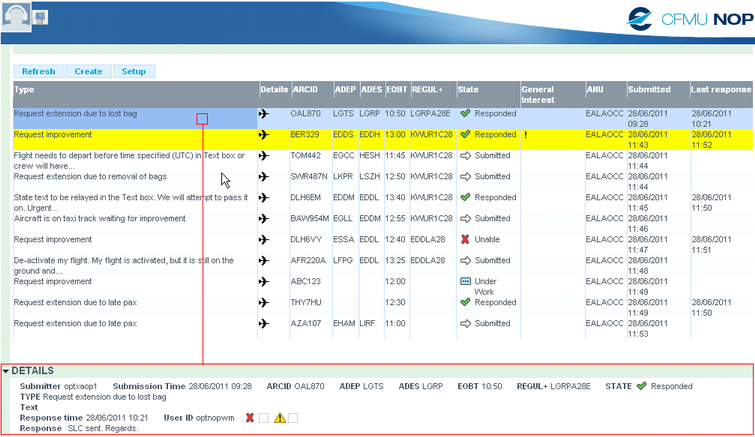 The State column contains a collection of pictogram indicating the status of the request, Submitted, Unable, Under Work and Responded: :