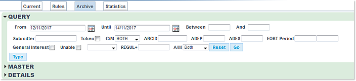 The QUERY section for the Archive Tab is also very similar to the one present on the Current Tab - with the exception of a number of additional filters allowing to specify Date and Time parameters: