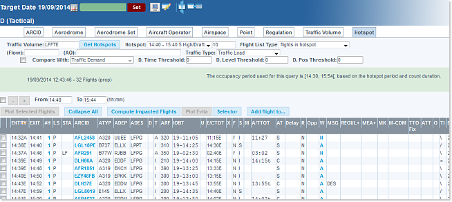 The Flights button opens a Flight List Detached View, with the Hotspot tab already selected, and pre filled with the current query parameters: