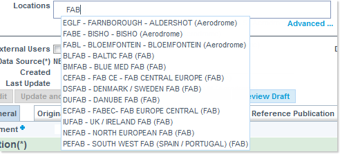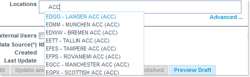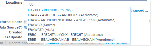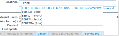- Locations: this field can contain a number of concerned locations (AERODROME, ACC, SECTOR, COUNTRY, IR, AUA, FAB, AXIS).