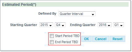 Note: you may check the Start Period TBD and/or End Priod TBD boxes when the start and/or end period is still to be determinated: