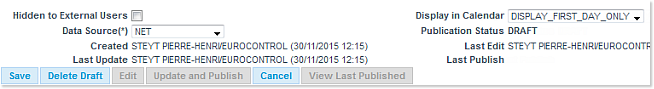 - Delete Draft: removes the event from the system and closes the view (enabled in EDIT mode, if no Published version of the event exists).