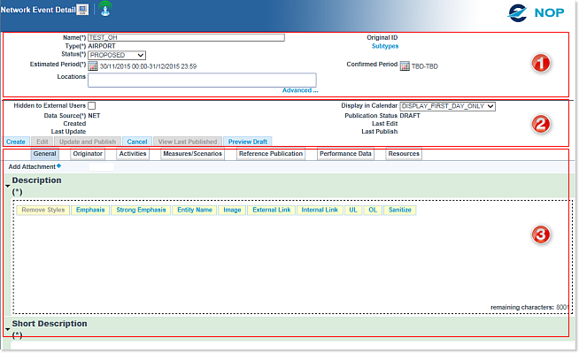 2 - Event Technical Area: containing additional parameters and displaying technical information. This area also contains the Button Bar, used to perform all actions in relation with the Network Events management.