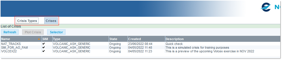 The Crises Detached View is dedicated to the viewing and management of crisis types and crises, by means of the following tabs: Crisis Types and Crises.
