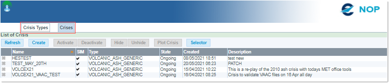 The Crises Detached View is dedicated to the viewing and management of crisis types and crises, by means of the following tabs: Crisis Types and Crises.