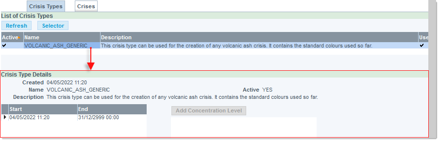 - Crisis Types Details (only visible when a Crisis Type has been selected in the List of Crisis Types)