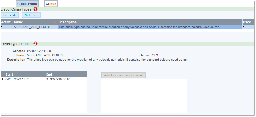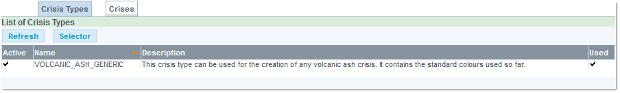 - Refresh: Used to refresh the display after having performed a change in the Crisis Types list, and/or to get the latest updates.