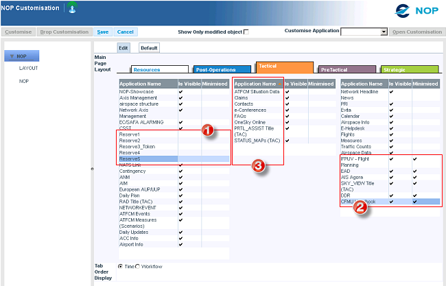 From each of the tabs, you can modify the Main page Layout attributes and establish, for each of the listed applications, which will be visible (checking or unchecking the corresponding field in the Is Visible column) and which will be minimzed by default (checking or unchecking the corresponding field in the Minimized column).