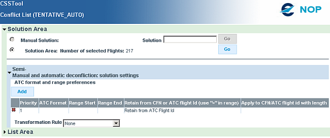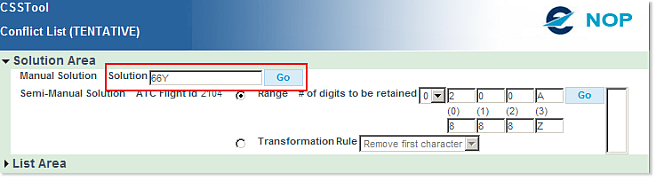 This will bring up the Conflict List (TENTATIVE) window, featuring the Solution Area where you have the option of entering a Manual Flight ID or using the Range to instruct the tool propose solutions.