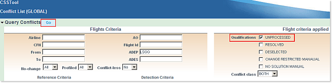 Clicking on the GO button from the Query Conflicts section will display the flights having conflicts matching the filtering criteria.