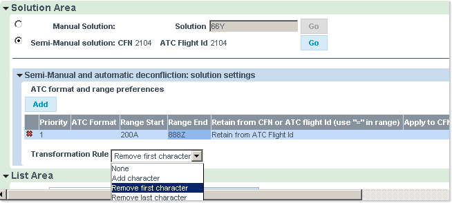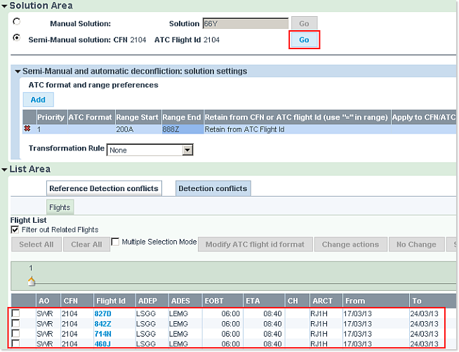 At this stage, it is possible to directly click on the GO button from the Solution Area section to autodeconflict the flights that were selected. This is however not recommended, unless you happen to have no preference for the proposed Call Sign formats.
