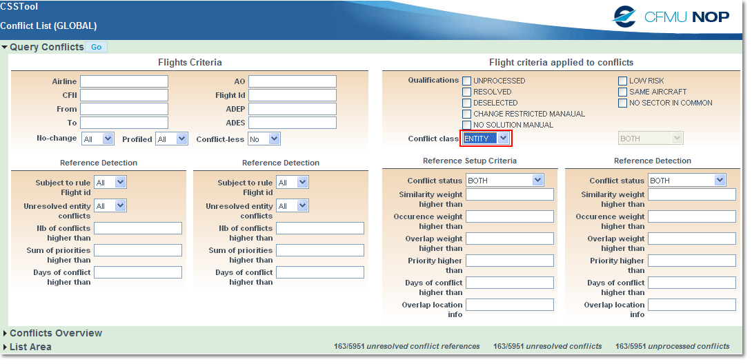 To do so, expand the Query Conflicts section and fill in the query fields as appropriate. For this example, we have selected the ENTITY Conflict class: