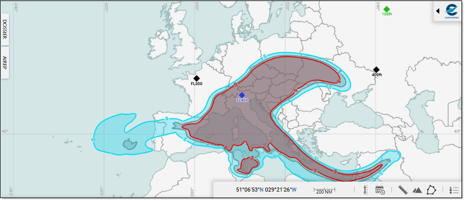 The EVITA Interactive Map is used to dynamically display the EVITA datasets (Dangers areas and Forecast) selected by means of the EVITA Selector, along with selected Flights and Airspaces impacted (or not) by the selected Crisis.
