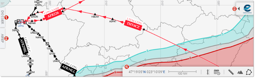 As for the AIREP, they are also plotted on the map, according to the color code described in the Dossier Tray chapter, and with the Altitude as label: