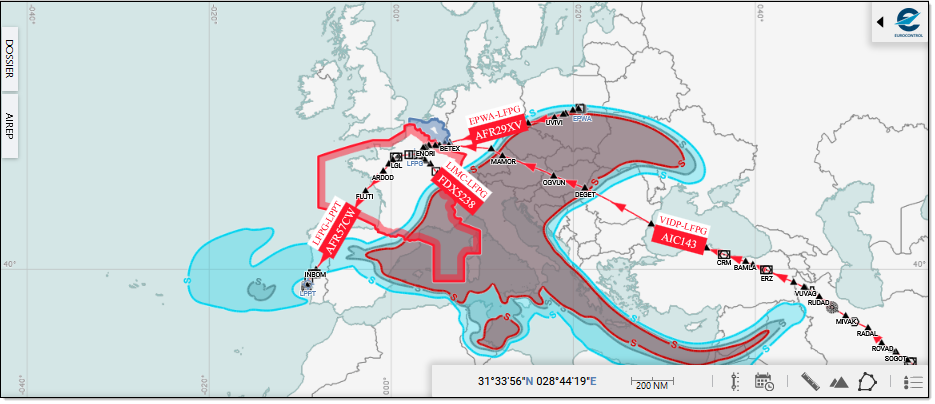 Unaffected flights are plotted in Black - the impacted flights being plotted in Red for easier identification - and impacted airspaces are similarly plotted in red, to differentiate from the unaffected ones displayed in Blue: