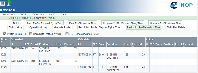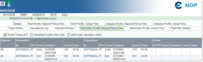 The Restriction Profile: Elapsed Flying Time and Restriction Profile: Actual Time tabs show the detailed information for the selected flight.