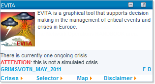 - When there is an ongoing crisis, its name (in the case of this example, GRIMSVOTN_MAY_2011) directly opens the corresponding Crises window