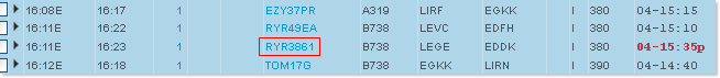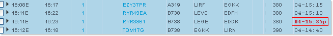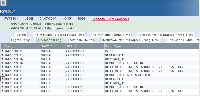Times showed in red and followed by the letter lowercase p in the IOBT column indicate the existence of a proposal flight for the currently displayed normal flight.
