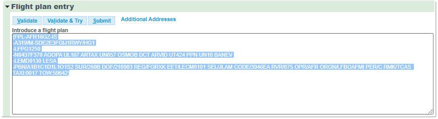 This is where you will enter (type or past from external source) the content of the Flight plan, in ADEXP or ICAO format.