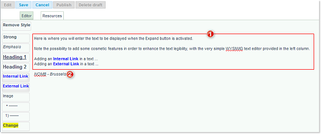 If the news item so requires, you may now insert in the body of the text some previously uploaded images. Using the simple Text Editor further described in this chapter (under the Styled Text section), you may also have text hyperlinks pointing to internal resources (files you have uploaded) or external URL's.