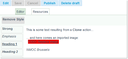 - the Headline News Editor opens with a copy of the source item - with the exception of imported resources, if any. In such an event, a TODO notice (in a red label) will be inserted to remind you to upload and place the missing elements: