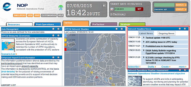 Attention: the Network Headline News Portlet in only available on the Tactical (orange) and PreTactical (purple) tabs. If you do not see the Portlet, please check the Tabs settings in the header of the Portal: