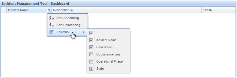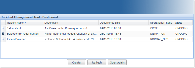 Attention: the Create button is only displayed when the proper configuration is loaded and the allowed user is connected - see the Incident Configuration section for more information. - Refresh: refreshes the list of incidents,