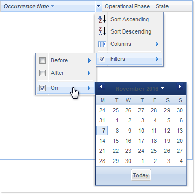 When a filter is activated, the corresponding column header is displayed in italics (Occurrence time in this example):