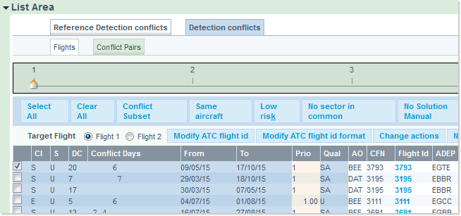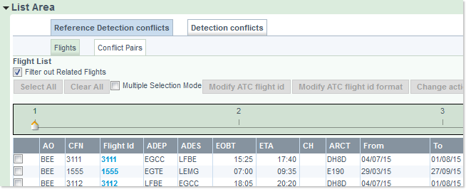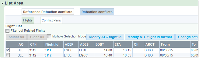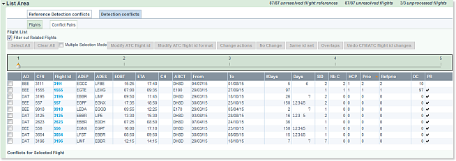 To reduce the number of lines on the page the list area is defaulted to filter on related flights. So for example AFR001 will only appear once on the left side of the list even though it may be involved in many conflicts.