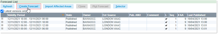 From the Forecast List section of the EVITA Forecast window, click on the Create Forecast button: