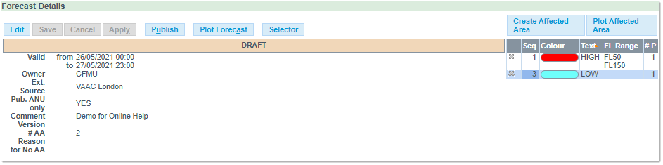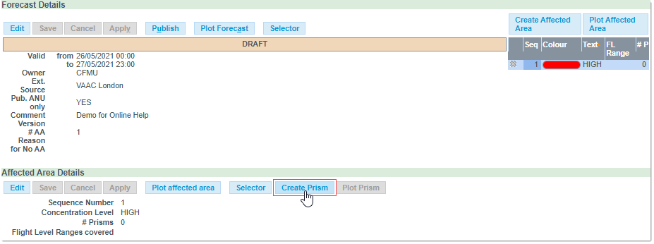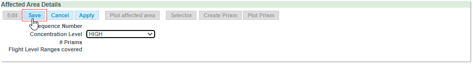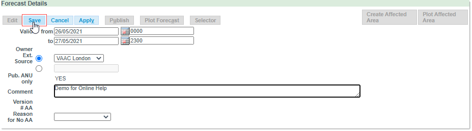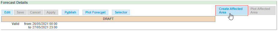 Important: you need to first Save a Forecast in order to enable the Area related buttons, namely Create Affected Area, Import Affected Area and Plot Affected Area.