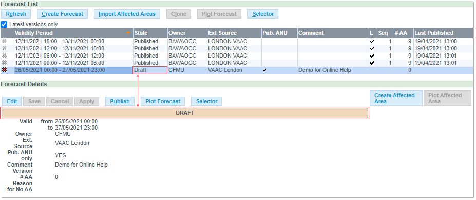 Note that the status is set to Draft in both the State column in the Forecast List, and in the info banner in the Forecast Details: