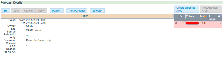 - The newly created Affected Area is now present in the Forecast Details section corresponding to the Validity Period selected in the Forecast List: