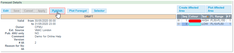 Click on the Publish button to have the Forecast visible to other EVITA users: