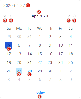 - Display of the Month and Year of the date currently selected - each providing link to select different Month and Year respectively,