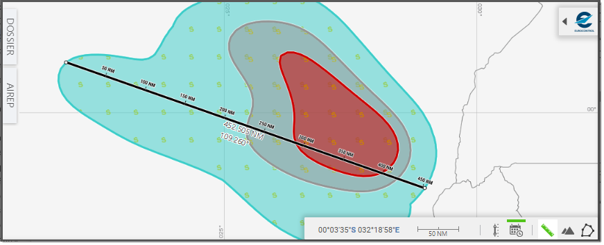 This tool allows you to draw straight segments between locations identified by a sequence of left-click selection and compute both the segments length and the running total length based on the sum of the shortest distances on great circle to go from one point to another point, expressed in NM:
