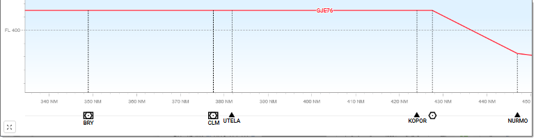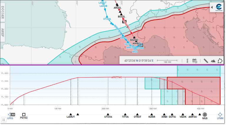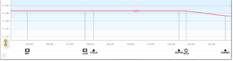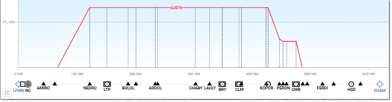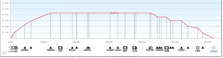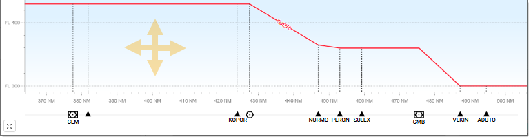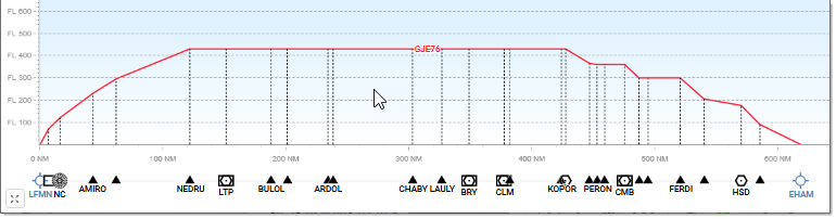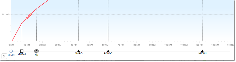 The FL axis provides the adjustable vertical scale. The NM axis displays, in addition to distances expressed in nautical miles, the various Waypoints and other significant points