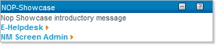 NOP-Showcase This Portlet is only visible to a restricted number of users, based on Profile. It currently provides shortcuts: E-Helpdesk Statistics Detached View NM Screen banner text editor