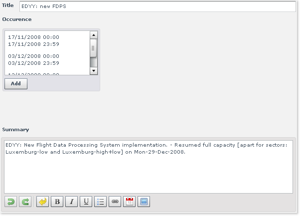 You Edit an occurence by simply clicking on its row in the table. You create a new Occurence by clicking on the Add button. And you delete a selected one by clicking on the Delete button.