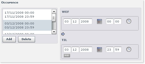 The Occurence section lists all the occurences of a given event, expressed as a pair of Start date and End date.